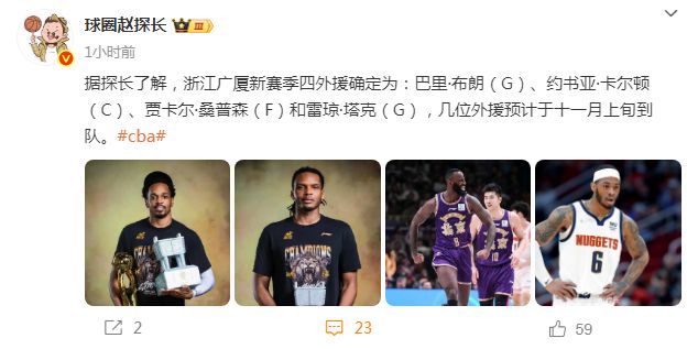 球圈赵探长报道:“浙江广厦新赛季四外援确定为巴里-布朗(G)、约书亚-卡尔顿(C)、贾卡尔-桑普森(F)和雷琼-塔克(G),几位外援预计于11月上旬到队。”